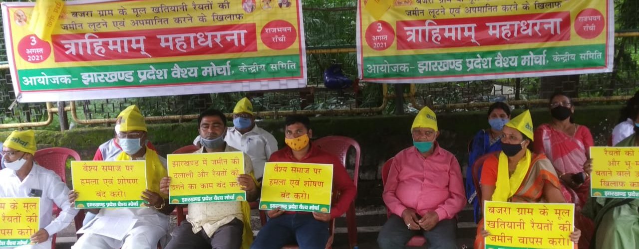 राँची : वैश्य समाज की जमीन लूट एवं उपायुक्त द्वारा बदमाश और भू-माफिया कहे जाने के खिलाफ आज 3 अगस्त को झारखंड प्रदेश वैश्य मोर्चा द्वारा राजभवन के समक्ष एकदिवसीय ‘त्राहिमाम महाधरना’ का आयोजन किया गया। इस महाधरना में वैश्य मोर्चा के केंद्रीय पदाधिकारियों, सदस्यों सहित मूल रैयत भी शामिल हुए। महाधरना की अध्यक्षता वैश्य मोर्चा के केंद्रीय अध्यक्ष महेश्वर साहु एवं संचालन प्रधान महासचिव बिरेन्द्र कुमार व केंद्रीय महासचिव इंदूभूषण गुप्ता ने संयुक्त रूप से किया। महाधरना कार्यक्रम के पश्यचात वैश्य मोर्चा की ओर से महामहिम राज्यपाल को स्मार-पत्र भी सौंपा गया, जिसकी प्रतिलिपि राष्ट्रपति , प्रधानमंत्री नरेन्द्र मोदी एवं गृह मंत्री अमित साह को भी भेजा गया है।