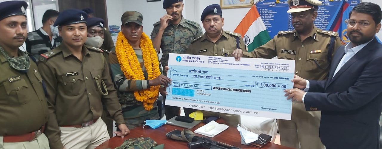 पलामू : पुलिस दबाव और संगठन की उपेक्षा से प्रभावित उग्रवादी संगठन जेजेएमपी (झारखंड जनमुक्ति परिषद) के सब जोनल कमांडर भवानी जी उर्फ भवानी भुईयां उर्फ भागीरथी राम ने रविवार को सरेंडर कर दिया। भवानी ने इंसास रायफल के साथ पलामू रेंज के डीआईजी राजकुमार लकड़ा, उपायुक्त शशि रंजन, एसपी चंदन कुमार सिन्हा, सहायक पुलिस अधीक्षक सह एसडीपीओ के. विजय शंकर सहित अन्य पुलिस पदाधिकारियों के समक्ष आत्मसमर्पण किया। मौके पर पलामू के उपायुक्त शशि रंजन ने झारखंड सरकार की आत्मसमर्पण एवं पुर्नवास नीति के तहत भवानी भुइयां को 1 लाख रूपये का चैक सौंपा। साथ ही चार डिसमिल जमीन, स्वरोजगार से जोड़ने, बच्चों की पढ़ाई और परिवार को सुरक्षा का भरोसा दिलाया। भवानी भुइयां जिले के रामगढ़ थाना क्षेत्र के हुटार टोला के उडरीटांड़ का रहने वाला है। भवानी उर्फ भागीरथ भुईंया, महेश भुइयां के इनकाउंटर में मारे जाने और रामसुंदर राम की हत्या के बाद सबजोनल कमांडर बना था। भवानी पांच बड़ी घटनाओं को अंजाम का आरोपी है।