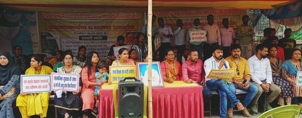 रांची:झारखंड सहायक प्राध्यापक अनुबंध संघ के द्वारा आयोजित राज्यपाल सह कुलाधिपति तथा मुख्यमंत्री के ध्यानाकर्षण कार्यक्रम के आज सातवें दिन राज्य के विभिन्न विश्वविद्यालयों व अंगीभूत महाविद्यालयों में कार्यरत घंटी आधारित अनुबंध सहायक प्राध्यापकों ने अपने मांगों रेगुलराइजेशन, यूजीसी रेगुलेशन के अनुसार न्यूनतम ग्रेड पे या ग्रौस सैलरी फिक्सेशन,टर्मीनेट शिक्षकों का सेवा बहाल करने को लेकर ध्यानाकर्षण हेतु राज भवन के सामने बैठे। डॉ०एस०के०झा ने कहा कि घंटी आधारित अनुबंध सहायक प्राध्यापकों के समर्थन में कल 12.00 बजे राज्य के पद्म श्री सम्मान से सम्मानित मुकुंद नायक एवं मधुमंसूरी हंसमुख कार्यक्रम स्थल पर आयेंगे। इसके अतिरिक्त जनजातीय परामर्शदात्री के पूर्व सदस्य रतन तिर्की भी राजभवन के सामने अनुबंध सहायक प्राध्यापकों के हितार्थ कल धरना प्रदर्शन कार्यक्रम में पहुंचेंगे। राज्य के सभी विश्वविद्यालयों से डॉ०किलिस मरांडी ने कहा कि देश और राज्य के शिक्षक जहां शिक्षा का पोषण करते हैं, वहीं हमारे राज्यों में उच्च शिक्षा के क्षेत्र में कार्यरत घंटी आधारित अनुबंध सहायक प्राध्यापकों का शोषण होते आया है।