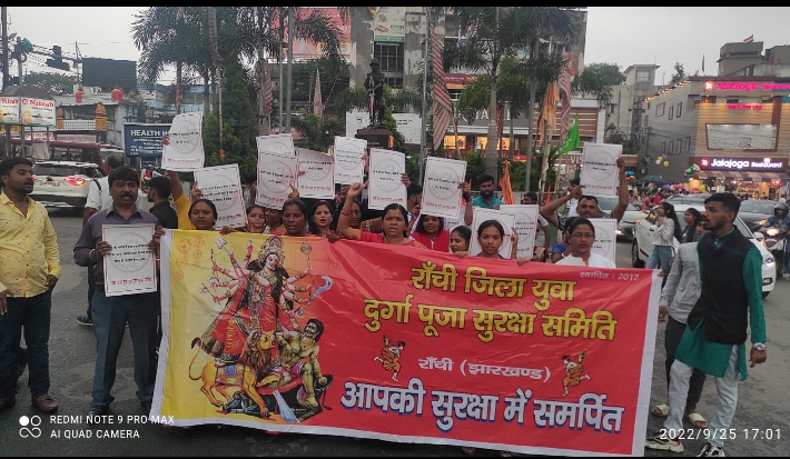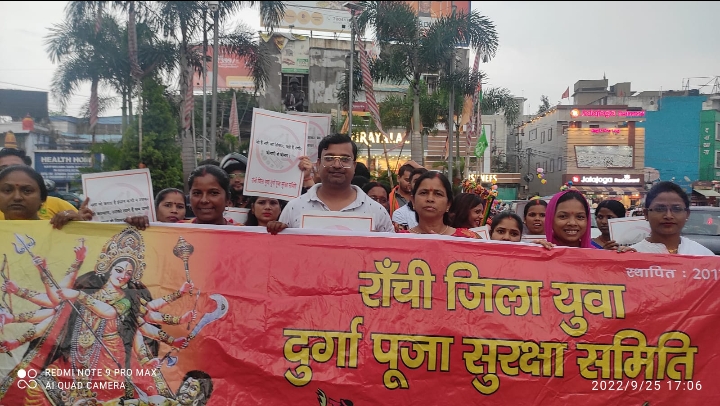 रांची: रांची जिला युवा दुर्गा पूजा सुरक्षा समिति के द्वारा आज जिला स्कूल से लेकर अल्बर्ट एक्का चौक तक मार्च निकाल कर नशा मुक्त दुर्गा पूजा मनाने हेतु जागरुकता अभियान चलाया गया । इस अभियान में बड़ी संख्या में महिलाओं के साथ साथ युवा उपस्थित रहें।