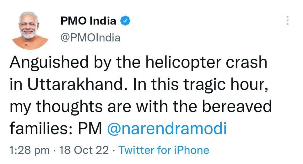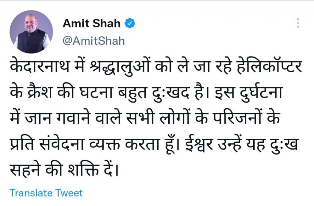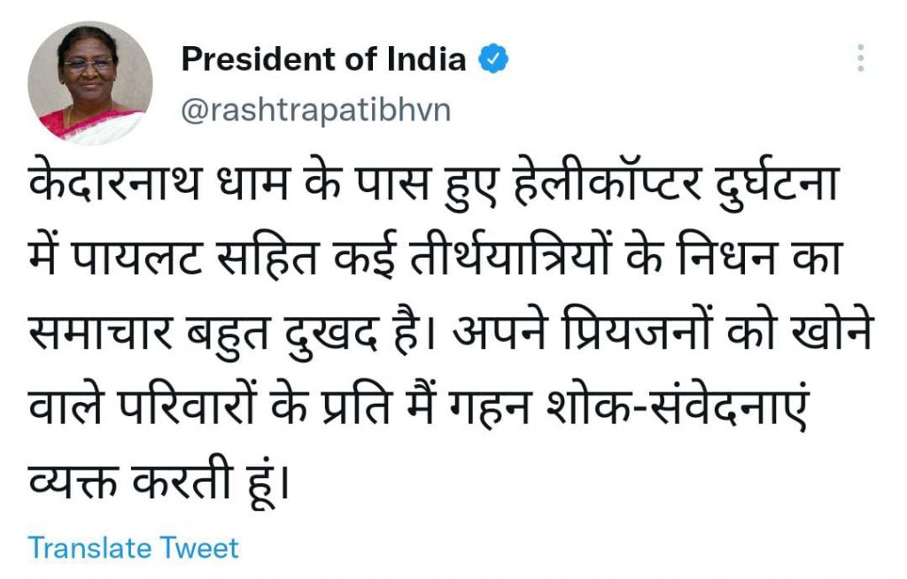 केदारनाथ- केदारनाथ में एक हेलीकॉप्टर दुर्घटनाग्रस्त हो गया है। हादसे में पायलट सहित सात लोगों की मौत हो गई है। यहां बारिश और बर्फबारी के बीच रेस्‍क्‍यू कार्य किया गया। राष्‍ट्रपति द्रौपदी मुर्मू, प्रधानमंत्री नरेन्‍द्र मोदी, यूपी के मुख्‍यमंत्री योगी आदित्‍यनाथ, गृहमंत्री अमित शाह समेत अन्य नेताओं ने घटना पर ट्वीट कर संवेदनाएं व्‍यक्‍त की हैं।
