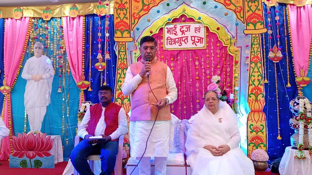 इस अवसर पर ब्रह्माकुमारी संस्थान की संचालिका राजयोगिनी ब्रह्माकुमारी निर्मला बहन ने समागम में उपस्थित सभी आगंतुकों को भाई दूज का टीका लगाया और योग युक्त दृष्टि से सभी को इस परिवर्तनों से अपहृत कर मुंह मीठा कराया भाई दूज के आध्यात्मिक रहस्य को बताते हुए उन्होंने ये बातें कही।चित्रगुप्त पूजा के एक रहस्य को करते हुए राजयोगिनी ब्रह्माकुमारी बहन निर्मला ने कहा कि मनुष्य के कर्मों का लेखा जोखा स्वतंत्र रूप से निराकार परमात्मा के पास रहता है उनका स्वयं का साकार शरीर नहीं होने के कारण उन्हें चित्रगुप्त कहते हैं वर्तमान कार्यकाल के अंत का समय ही उनके अवतरण का समय है।