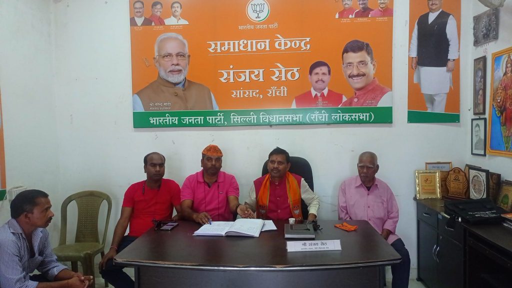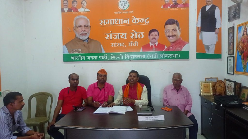 सिल्ली:- सिल्ली प्रखंड अंतर्गत शनिवार को भारतीय जनता पार्टी के समाधान केंद्र में रांची जिला ग्रामीण अध्यक्ष सुरेंद्र महतो की अध्यक्षता में एक अवश्यक बैठक की गई! इस बैठक मे सभी मंडलों अध्यक्ष एवं कार्यकर्ता मौजूद थे! बैठक में मोदी जी का 100 वां एपिसोड मन की बात कार्यक्रम को लेकर विचार विमर्श कर रूपरेखा तैयार किया गया!