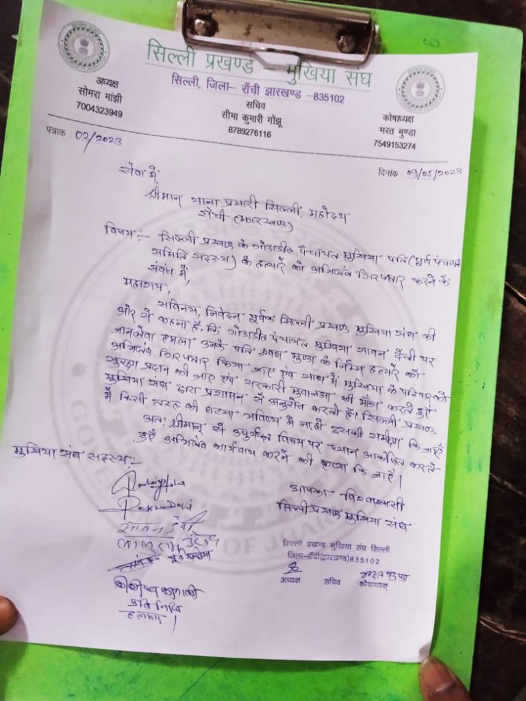 सिल्ली प्रखंड के मुखिया संघ द्वारा सिल्ली थाना प्रभारी को ज्ञापन सौंपते हुए अपराधी को जल्द से जल्द पकड़ने की एवं कड़ी से कड़ी सजा दिलाने की मांग की ।