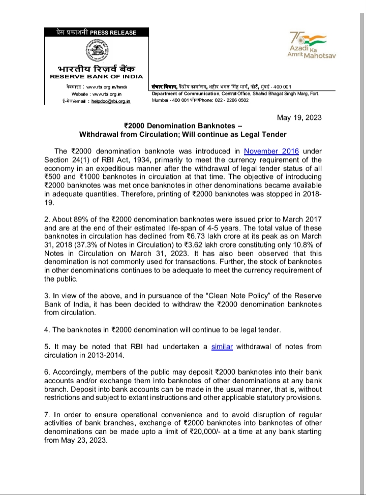 भारतीय रिजर्व बैंक ने सबसे बड़ी करेंसी 2000 रुपये के नोट पर बड़ा फैसला लिया है. रिजर्व बैंक के अनुसार, 2000 रुपये का नोट लीगल टेंडर तो रहेगा, लेकिन इसे सर्कुलेशन से बाहर कर दिया जाएगा.